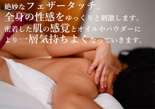 3.あなたは全身を美女に委ねているだけで、どんどん気持ちよくなっていきます。 絶妙なフェザータッチで全身の性感をゆっくりと刺激します。 密着した肌の感覚と、オイルやパウダーにより一層気持ちよくなっていきます。 キャストはあなたの乳首など敏感な箇所をみつけ、いやらしくジラしてこの上ないゾワゾワ感をお楽しみ下さい。